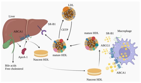 Apolipoprotein A-I (ApoA-I), a major apolipoprotein of HDL, is mainly secreted from the liver and small intestine. The secreted apo A-I gains phospholipids and cholesterol via ATP binding cassette transporter A1 (ABCA1) from peripheral tissues to form discoidal HDL (preβ HDL) and further effluxed cellular cholesterol via ATP binding cassette transporter G1 (ABCG1), and SR-BI, which leads to the formation of mature HDL particles by lecithin cholesterol acyltransferase (LCAT) [22,23,24,25]. The majority of cholesterol ester (HDL-CE) is transferred from HDL to VLDL and LDL by CETP and is taken up by LDL receptor (LDLR) in the liver [26].