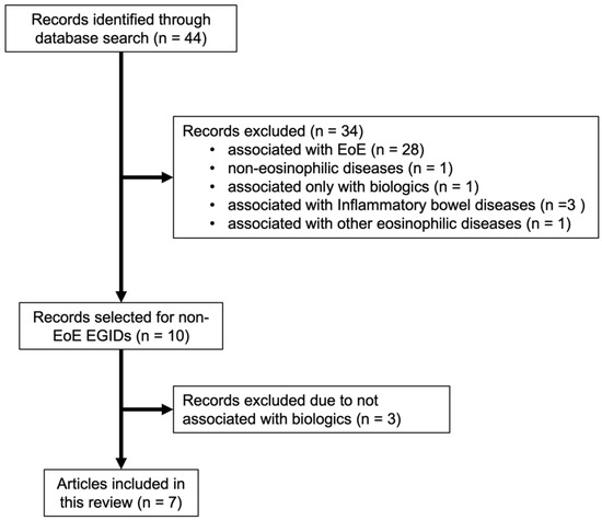 The search strategy yielded 44 references. Additionally, 28, 3, 1, 1, and 1 references were only associated with EoE, inflammatory bowel diseases, other eosinophilic diseases, non-eosinophilic diseases, and a biologic, respectively, and were thus excluded. Among the remaining 10 references related to non-EoE EGIDs, three were excluded because they were not related to biologic therapy. In total, seven articles were included in this review.