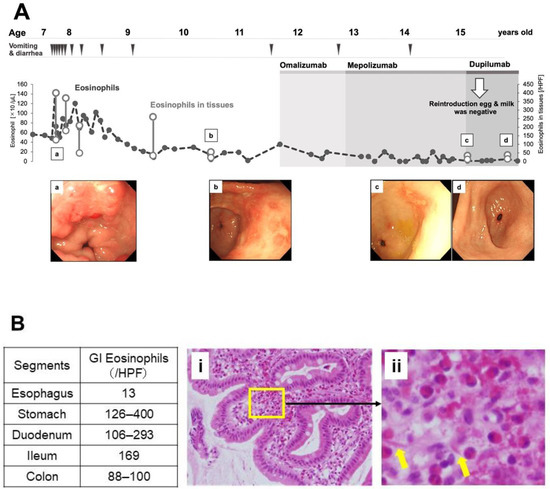In our case, dupilumab administration led to the acquisition of tolerance to foods responsible for non-EoE EGID. A 15 year-old girl presented with frequent diarrhea and vomiting at the age of 7 years and was diagnosed with non-EoE EGID, including EoG, EoD, and EoC based on GI endoscopy (Figure 2A,B). Non-EoE EGID was associated with protein-losing enteropathy. Hen’s eggs and cow’s milk consumed daily in school lunches were determined as causative foods and were subsequently removed; this elimination improved the symptoms and intense peripheral blood eosinophilia, but severe GI eosinophilia persisted. Of note, GI eosinophil counts were high, even when we assessed the tissue eosinophil count using recent criteria for non-EoE EGID in consideration of eosinophils physiologically present in the GI tract [5,26]; additional foods were eliminated empirically, and resulted in additional improvements. In the food reintroduction process, cow’s milk was found to be the cause. The patient maintained symptomatic remission of non-EoE EGID by avoiding possible offending foods. At the age of 11 years, she began taking omalizumab for poorly controlled asthma; however, owing to the inadequate response, her medication was switched to mepolizumab at the age of 12 years. Two years later, her asthma symptoms worsened, and she was started on dupilumab when she was 15 years old. Both the asthma and its symptoms improved, and an oral reintroduction confirmed that the patient had developed tolerance to hen’s eggs and cow’s milk (Figure 2A). The successful reintroduction seemed to be due to the effect of dupilumab, since she had occasionally presented symptoms after accidental consumption of cow’s milk or hen’s eggs during omalizumab and mepolizumab treatments. Anti-immunoglobulin E (IgE) antibodies and the suppression of the interleukin (IL)-5 signaling pathway improved the endoscopic findings and chronic digestive symptoms of non-EoE EGID; nevertheless, acute and subacute symptoms had occurred due to ingestion of the causative foods, meaning that the improvements were not clinically sufficient, and suppression of the IL-4/IL-13 signaling pathways led to the acquisition of tolerance to the causative foods.