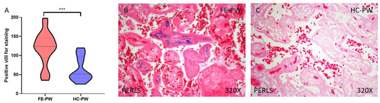 Histopathological study of iron deposits using the Perls’/Prussian Blue staining for positive villi (A), in the FE-PW (B), and HC-PW (C) group. FE-PW = first psychotic episode during pregnancy. HC-PW = healthy controls pregnant women. p < 0.001 (***).