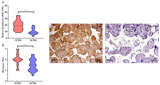 On the other hand, we evaluated the gene and protein expression of TFRC in the placentas of both FE-PW and HC-PW through RT-qPCR and immunohistochemistry, respectively. Our results help to define the fact that FE-PW display a significant increase in the gene expression of TFRC (FE-PW = 19.983 ± 7.635 relative quantity mRNA [RQ]; HC-PW = 10.388 ± 4.801 RQ; *** p < 0.001, Figure 2A). In respect to protein expression, we observed that TFRC expression was significantly higher expressed in FE-PW (FE-PW = 2.023 ± 0.587; HC-PW = 1.500 ± 0.562, ** p = 0.006, Figure 2B). Following histopathological observations, TFRC appears to be broadly expressed in the different cells of the villous structure (Figure 2C).