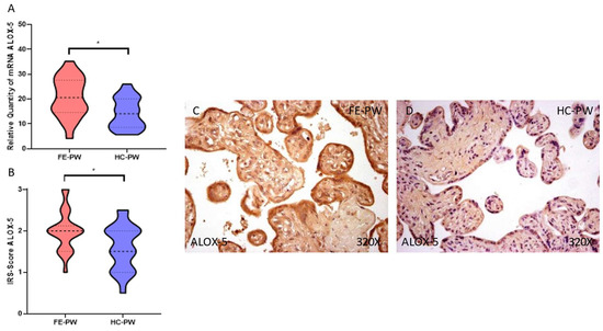 (A) ALOX-5 mRNA expression in both the FE-PW (first episode of psychosis in pregnancy) and HC-PW groups (healthy controls). (B) IRS-Scores for ALOX-5 expression in the placenta villi of the FE-PW group and the HC group. (C,D) Images showing the immunostaining for ALOX-5 in the placenta villi of the FE-PW group and the HC-PW group. p < 0.05 (*).