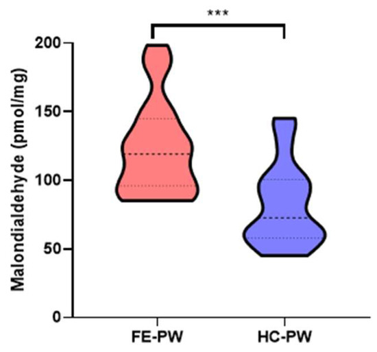 Finally, the levels of MDA in the placentas of the FE-PW group were significantly higher than those found in the HC group (FE-PW = 122.965 ± 34.259 pmol/mg; HC-PW = 81.821 ± 30.026 pmol/mg, *** p < 0.001, Figure 5).