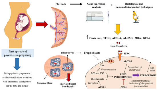 A global view of the main aspects and implications discussed in this work. As showed prior, a first episode of psychosis in pregnancy entails multiple challenges for healthcare professionals. This is because both the symptoms or possible interventions may have detrimental consequences for both the fetus and the mother. In the present work, we have demonstrated that the placentas of these women present an increased gene and protein expression of different components that are directly involved in the regulation of ferroptosis and lipid peroxidation. This fact, together with an increased detection of ferric ions, may be an indicator of iron accumulation in the placenta, thereby defining a possible pathophysiological role from these disturbances.