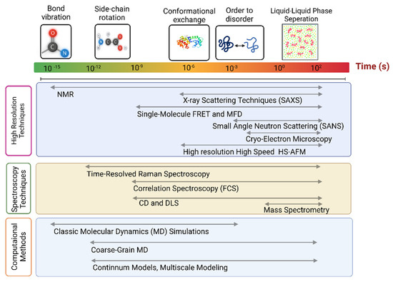 From a general experimental perspective, confirming that conclusions are consistent with multiple different experimental methods inspires increased confidence. For example, some methods require modification of molecules with extrinsic labels (fluorescence or EPR for example). Consistency with other measurement methods that do not use the modifications or use different modifications can confirm that such modifications do not affect the results in detrimental ways. In the integrative structural biology approach applied to IDPs, using different methods also has greater benefits because different methods have sensitivities to distinct length or time scales and even different concentration ranges (Figure 1). IDPs have behaviors that span broad ranges in these properties, making the use of multiple methods almost essential. For one example, liquid–liquid phase separation (LLPS) phenomena occur for a number of IDPs where concentrations are a key controlling factor [38]. Before discussing applications of integrative structural biology approaches to IDPs (see Figure 1), we first briefly describe some of the key individual methods used to characterize IDPs.