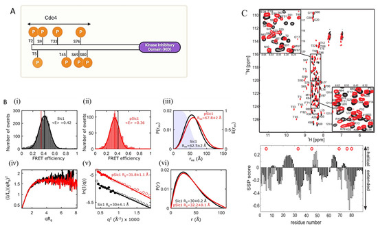 An integrative approach to elucidate IDP structure. (A) Schematic representation of full-length intrinsically disordered Sic1 protein and CPD phosphorylation sites in the N-terminal domain. The minimum functional KID fragment, the last 70 residues, is indicated in the purple box. (B) top three panels (i–iii) show smFRET efficiency histograms of Sic1 and pSic1 and end to end probability distributions. iv–vi show SAXS data for Sic1 and pSic1 and deduced Rg, which was estimated to be approximately 30 Å for Sic1 and 32 Å for pSic1 [170]. (B) is adapted with permission from [170]. Copyright 2020, American Chemical Society. (C) Upper panel displays 1HN-15N correlation spectra of Sic1 (black) and pSic1 (red). The lower panel shows experimentally determined secondary structural propensity (SSP) values (described in [175]) for Sic1 (black bars) and pSic1 (open bars). Note that the helical vs. extended interpretations are marked on the right axis. Red circles indicate the locations of the phosphorylation sites [175]. (C) is reproduced with permission from [175]. Copyright 2008, National Academy of Sciences, USA.