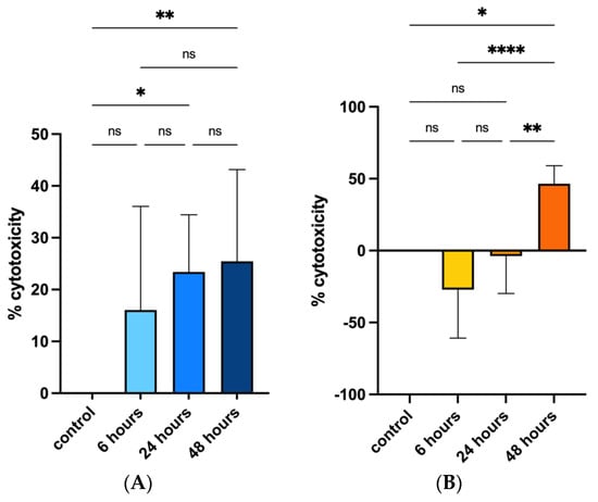 Effects of PS-MPs treatment on cytotoxicity in CMT-93 (A) and HRT-18 (B), respectively. Cytotoxicity was evaluated both in control group and 6, 24 and 48 h after 1 mg/mL PS-MPs treatment via MTT assay. Percentage was evaluated using cytotoxicity rate (100 × (control − samples)/control). The error bars indicate Standard Deviation. **** p-value ≤ 0.0001; ** p-value ≤ 0.01; * p-value ≤ 0.05; ns p-value > 0.05.