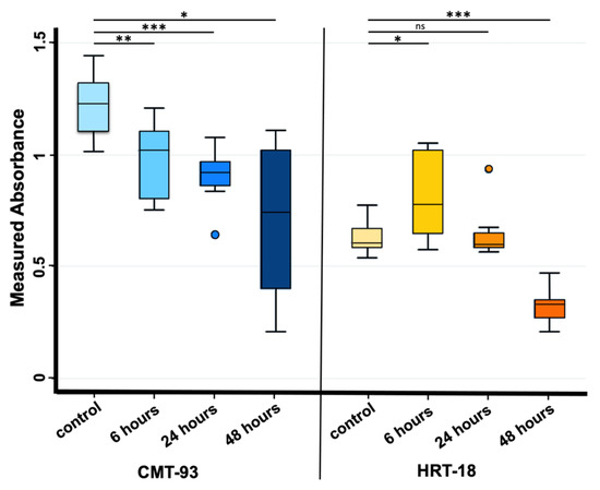 Absorbance values observed at OD590 nm in CMT-93 (left) and HRT-18 (right) cell cultures measured both in the control group and 6, 24 and 48 h after 1 mg/mL PS-MPs treatment via MTT assay. *** p-value ≤ 0.001; ** p-value ≤ 0.01; * p-value ≤ 0.05; ns p-value > 0.05. Regression model analysis showed a statistically significant trend in CMT-93 cells (left) considering controls and all exposure times (beta value: −0.011, CI: −0.018 −0.006).