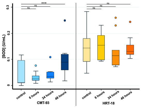 Considering SOD analysis, a statistically significant increase in SOD activity was observed only between controls and 48 h exposure time in CMT-93 cell lines, whereas for HRT-18 cell lines this statistical significance was not found for any exposure time due to the presence of an outlier value among the control group (Figure 4).