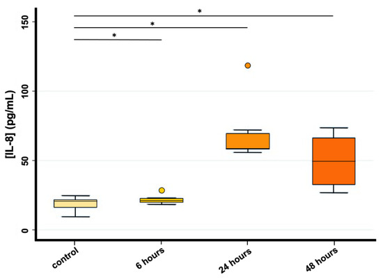 IL-8 concentration analysis performed on HRT-18 cells showed a statistically significant difference between controls and all exposure times (p < 0.05), indicating an increased release of IL-8 in the medium of HRT-18 cells 6, 24 and 48 h after PS-MPs exposure (1 mg/mL). No linear trend was found; the concentration of IL-8 showed a peak at 24 h and then decreased again in the 48 h exposure (Figure 5). Unfortunately, IL-8 concentration analysis was performed only on HRT-18 data and not on CMT-93 due to the infeasibility to include this cytokine in the murine assay.