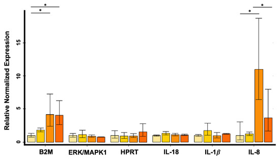 Relative expression levels of B2M, MAPK1/ERK, HPRT, IL-18, IL-1β and IL-8 in HRT-18 cell line evaluated by quantitative Real-Time PCR (* p < 0.05). Data were reported in linear scale. Cyclin D1 and β-Actin were used as reference genes for normalization. The error bars indicate Standard Deviation.