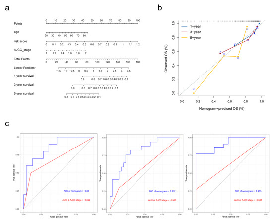 Establishment and validation of the nomogram in predicting overall survival of cirrhotic HCC in the TCGA-LIHC. (a) A prognostic nomogram predicting 1-, 3-, and 5-year overall survival rates of HCC. (b) Calibration plot of the nomogram for predicting the probability of survival at 1, 3, and 5 years. (c) Time-dependent ROC curve of the nomogram for 1-, 3-, and 5-year overall survival predictions comparing with AJCC stage.