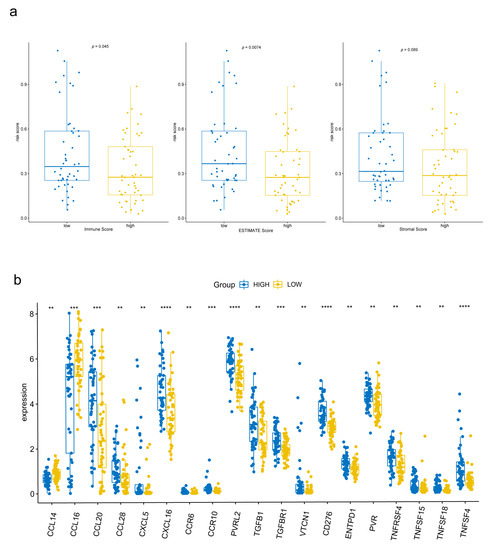 To explore the relationship between the signature and tumor immune microenvironment, we performed ESTIMATE to calculate immune scores, ESTIMATE scores, and stromal scores for 97 cirrhotic HCC patients from TCGA. Patients were divided into high group and low group according to the scores, respectively. As a result, patients with lower immune scores and ESTIMATE scores had higher risk scores (Figure 7a). Also, the expression of genes encoding immunomodulators and chemokines were compared between high-risk and low-risk group. In 178 genes we downloaded from TISIDB database, 127 could be found in TCGA expression matrix and 30 were differently expressed between two groups (p < 0.05). The most significant ones (p < 0.01) were shown in Figure 7b.