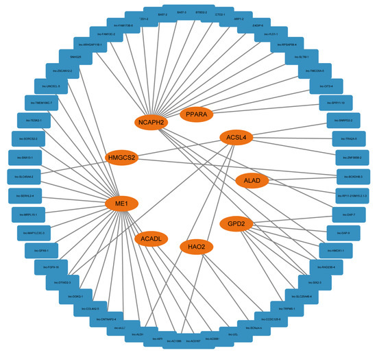 Long non-coding RNA (lncRNA) plays an important role in gene regulation and cancer development. To explore lncRNA, which is related with FAM and participates in HCC progression, we extracted the sequence results of lncRNA and performed difference analysis and Mfuzz cluster analysis on it (Figure S2a,b). A total of 2107 dynamic changing lncRNAs were obtained, including 960 upregulated ones and 1147 downregulated ones (Figure S2c and Table S3). Pearson correlation coefficients were calculated between FAM-related genes and lncRNAs in order to explore the potential regulatory relationship. Correlation coefficients >0.9 and p < 0.001 were set as threshold to identify FAM-related lncRNA. Finally, a FAM-related regulatory network containing 9 mRNAs and 54 lncRNAs were established (Figure 8). Correlation coefficient between lncRNA and mRNA was established in Table S2.