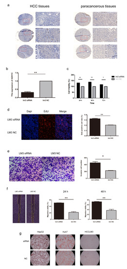We performed survival analysis on the 3 genes selected in the signature. ADH1C was identified as a protective factor and may play a critical role in HCC progression (Figure S1). Then, the expression of ADH1C was verified in 3 pairs of HCC and adjacent normal tissues using IHC. As a result, ADH1C expression was significantly downregulated in HCC tissues on protein level (Figure 9a). To further explore the function of ADH1C in HCC development, siRNA was transfected into the HCCLM3 cell line to knock down ADH1C (Figure 9b). The CCK8 and EdU assays illustrated that a knockdown of ADH1C can significantly enhance the proliferation of HCCLM3 transfected with siRNA (Figure 9c,d). In addition, we observed that ADH1C silencing effectively enhanced the migration ability of HCCLM3 cells by performing transwell and wound healing assays (Figure 9e,f). In brief, knockdown of ADH1C effectively promoted the proliferation and migration of HCCLM3 cells. In addition, Oil red O staining was performed in three HCC cell lines to check the lipid droplets’ accumulation after transfection (Figure 9g).