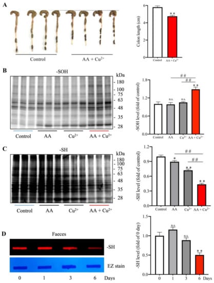 Effects of in vivo administration of AA and Cu2+ on colon length and oxidation. (A) Effects of combined administration on colon length. Mice were administered 100 mg/kg AA or 1 mg/kg Cu2+ in combination via oral gavage once a day for 6 days. The colon was taken, photographed (A), and measured for length. The results shown on the right side of the photo are mean ± SE (n = 4–6; ** p < 0.01 vs. control). (B,C) Effects of AA plus Cu2+ on the oxidative modification of -SH groups in colon proteins. Mice were administered with 100 mg/kg AA or 1 mg/kg Cu2+ or both in combination via oral gavage once a day for five consecutive days. The level of -SH groups and -SOH formation in colon lysates were detected. The quantitation of the bands was performed, and data are shown in the bar graph below the blot. Data shown are mean ± SE (n = 3–4; n.s.: not significant; * p < 0.05; ** p < 0.01 vs. control; ## p < 0.01). (D) Effects of AA plus Cu2+ administration on the level of -SH groups in feces. Proteins from feces were subjected to Dot blot analysis for the level of -SH groups using a maleimide-labeling assay. The result of the densitometric analysis of the bands is shown at the right side of the blot. Data shown are mean ± SE (n = 3, n.s.; ** p < 0.01 vs. control).