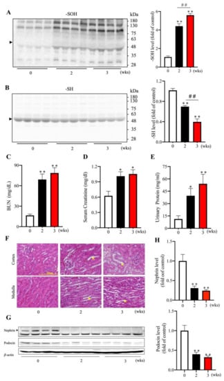 Long-term administration of AA and Cu2+ on renal structure and functions. (A,B) Effects of long-term administration on serum proteins oxidation. Mice were administered 100 mg/kg AA or 1 mg/kg Cu2+ or both in combination via oral gavage once a day for two and three weeks. Serum was collected and analyzed for the level of -SH groups and -SOH formation. The densitometric quantitation of the bands around 50~60 kDa (arrowhead) was performed and presented as the bar graph on the right side of the blot. Data shown are mean ± SE (n = 4; ** p < 0.01 vs. control; ## p < 0.01). (C–E) Effects of AA plus Cu2+ on renal functions. The level of BUN, creatinine and urinary proteins were measured. The data shown are mean ± SE (n = 4–8; * p < 0.05; ** p < 0.01 vs. control). (F–H) The effect of AA plus Cu2+ on renal histopathological changes and podocyte injury markers. Representative images of HE staining of the kidney are shown in (F). Note that AA plus Cu2+ destroyed the intact epithelial architecture, including the loss of brush border, detachment of epithelial cells, and tubular cell vacuolation (arrow). The effect of AA plus Cu2+ on the podocyte injury markers nephrin and podocin is shown in (G,H). Data shown in (H) are mean ± SE (n = 4; ** p < 0.01 vs. control).
