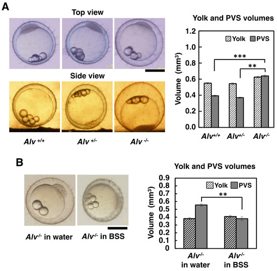 When the fertilized eggs were observed from a top view, which was obtained by the stereoscope in a normal position, the Alv−/− eggs had larger chorions than the Alv+/+ and Alv+/− eggs (Figure 3A, top view). This observation became obvious when the eggs were observed from a side view, which was attainable using a typical optical microscope that was laid down by 90° (Figure 3A, side view). When the PVS and yolk volumes were measured, the PVS volume of Alv−/− eggs was 1.7 times larger than those for Alv+/+ and Alv+/− (0.64 mm3 for Alv−/− vs. 0.39 and 0.37 mm3 for Alv+/+ and Alv+/−, respectively) (Figure 3A, right) and the yolk volume of Alv−/− eggs was not significantly different than those of Alv+/+ and Alv+/− eggs (0.63 mm3 for Alv−/−; 0.55 and 0.54 mm3 for Alv+/+ and Alv+/−, respectively; p > 0.05 in both cases) (Figure 3A, right). These data show that Alv−/− fertilized eggs were larger than Alv+/+ and Alv+/− eggs because of the enlarged PVS volumes. Since the chorion is known as a semi-permeable membrane involved in the osmotic pressure of the egg [2,26], the PVS and yolk volumes were also compared between eggs that were fertilized in water and BSS, an isotonic solution to the egg (Figure 3B). The yolk volume was the same between the fertilized eggs in water and BSS (0.38 vs. 0.41 mm3). On the other hand, the PVS volume of Alv−/− eggs in water was 1.5 time larger than that in BSS (0.56 vs. 0.38 mm3). The results showed that the PVS volume of the Alv−/− eggs was reciprocal to the salinity, consistent with the fact that the chorion of the Alv−/− eggs retains the semi-permeable property after fertilization.
