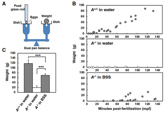 To evaluate the mechanical strength of the soft chorion eggs, the toughness of the chorion was measured using an Iwamatsu’s device with a dual pan balance. A schematic representation of the device is shown in Figure 4A. Chorion hardening of eggs in water is known to proceed in a time-dependent manner [27]. As expected, the toughness of the chorion of the WT eggs that were fertilized and incubated in water (designated Alv+/+ eggs in water) increased in proportion to time after fertilization and the value was 90 g at 120 min post-fertilization (mpf) (Figure 4B, Alv+/+ eggs in water). In contrast, the Alv−/− eggs that were fertilized and incubated in water (Alv−/− eggs in water) were easily crushed by the 1–2 g for the first 150 mpf (Figure 4B, Alv−/− eggs in water). Interestingly, the toughness of the chorion of Alv−/− eggs that were fertilized and incubated in BSS (Alv−/− eggs in BSS) moderately increased as the post-fertilization time increased, with a value of 32 g at 120 mpf (Figure 4B, Alv−/− eggs in BSS). The toughness of the chorion of three types of eggs, i.e., Alv+/+ eggs in water, Alv−/− eggs in water, and Alv−/− eggs in BSS, was compared at 3 hpf (Figure 4C). The values were 118, 19.7, and 70.1 g for the Alv+/+ eggs in water, Alv−/− eggs in water, and Alv−/− eggs in BSS, respectively. Thus, the toughness value for Alv−/− eggs was one-sixth that of the WT eggs. Therefore, Alv−/− eggs prominently show a soft chorion phenotype. Notably, the toughness value of Alv−/− eggs in BSS was 3.5 time higher than that of Alv−/− eggs in water. The soft chorion phenotype of Alv−/− eggs was partially rescued when the eggs were incubated in BSS instead of water. Although 90% of the fertilized Alv−/− eggs from the Alv−/− medaka pair in water were crushed during collection (Figure 2B), most fertilized Alv−/− eggs could be collected intact when fertilization was performed in BSS.