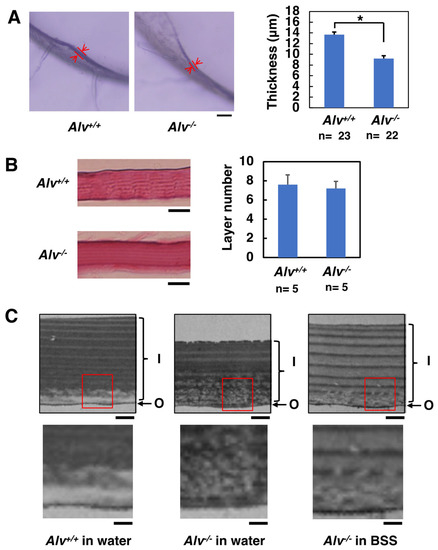 The histological observations of chorions isolated from fertilized eggs of Alv+/+ and Alv−/− genotypes were performed (Figure 6A,B). The average thickness values of the sectioned chorions from Alv+/+ and Alv−/− eggs were significantly different, i.e., 14 and 9.2 μm (p < 0.05), respectively (Figure 6A). Thus, the Alv−/− chorion was thinner than that of the Alv+/+ chorion. As previously reported [27], the chorion consists of a multiple-layer structure (Figure 6B, left). The layer numbers of Alv+/+ and Alv−/− chorions were on average 7.2 and 7.6, respectively (Figure 6B, right). However, the difference was not statistically significant. These results suggest that Alv−/− eggs had thin chorions without changing their basic layer structure.