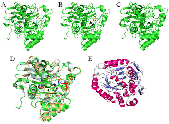 The crystals of the huDHOase complexes belong to space group C2221, with one molecule per asymmetric unit (Table 1). The phases were obtained by molecular replacement using the structure of the apo-huDHOase (PDB ID 4C6C) as the search model [22]. The crystal structure of huDHOase complexed with malate (PDB ID 8GW0) and 5-FU (PDB ID 8GVZ) was solved at a 1.64 and 1.97 Å resolution, respectively. The amino acid residues 1456–1459 (the N-terminus) and 1822–1846 (the C-terminus) in the ternary structure of huDHOase were disordered and unobserved. The binding of malate (Figure 2A) or 5-FU (Figure 2B) did not significantly influence the overall structure of huDHOase (Figure 2C). Superimposing these three structures indicated the different positions of the active site loop (Figure 2D). Similar to the apo form (Figure 2C), the global architecture of these huDHOase complexes revealed a TIM-barrel structure that consisted of 15 α-helices and 13 β-strands (Figure 2E). The catalytic metal center in these huDHOase complexes consisted of His1471, His1473, His1590, His1614, and Asp1686, which were selfassembled. Lys1556 remained carbamylated (Kcx1556) regardless of ligand binding. However, these huDHOase complexes only contained two Zn ions, rather than the three Zn ions found in apo-huDHOase.
