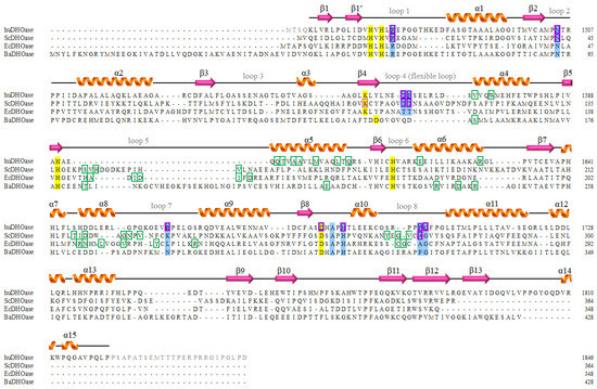Multiple amino acid sequence alignment of DHOases. Sequences of huDHOase, ScDHOase, EcDHOase, and BaDHOase are analyzed and compared. huDHOase shares an identity with ScDHOase, EcDHOase, and BaDHOase by 39%, 21%, and 32%, respectively. The secondary structures of the huDHOase–malate complex are labeled. The unobserved residues 1456–1459 and 1822–1846 in the huDHOase ternary structure are colored in grey. The metal-binding sites are shaded in yellow. The substrate-binding sites are shaded in blue. The amino acids that are involved in the monomer–monomer interface via hydrogen bonding are boxed in green. The malate and 5-FU binding sites are boxed in purple and pink, respectively.