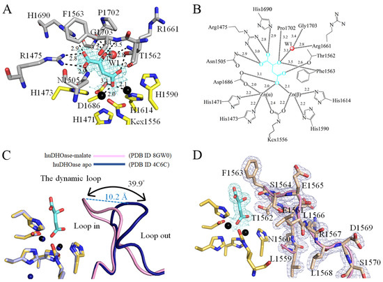 Malate is an inhibitor of huDHOase [33]. In order to determine how malate can bind to huDHOase, we determined the crystal structure of huDHOase complexed with malate (Figure 5). This complexed structure revealed that malate is bound at the active site of huDHOase (Figure 5A). The two metal ions and residues, R1475, N1505, T1562, F1563, R1661, D1686, H1690, P1702, and G1703, were involved in malate binding (Figure 5B). R1475, N1505, and T1562 are also known as substrate-binding residues in huDHOase. Interestingly, huDHOase bound to malate via the loop-in mode (Figure 5C,D). Prior to this study, it was well-established that huDHOase binds to nonsubstrate ligands via the loop-out mode [22], e.g., the dynamic loop did not interact with the ligand or with the rest of the active site of huDHOase. In order to further analyze how this nonsubstrate ligand can bind to huDHOase via the loop-in mode, the structures of apo-huDHOase and the huDHOase–malate complex were superimposed (Figure 5C) for the sake of comparison. We found that the dynamic loop in the huDHOase–malate complex was shifted by a distance of 10.2 Å and an angle of 39.9o for malate binding. In addition, the two residues on this dynamic loop in huDHOase that are crucial for catalysis, T1562 and F1563 [48], also interacted with malate (Figure 5B). Thus, we concluded that huDHOase can bind to malate via the loop-in mode, e.g., the flexible loop does not move away from the active site.