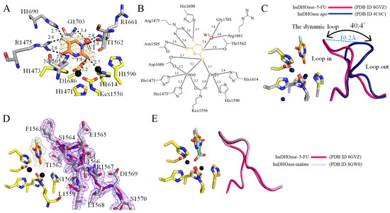 DHOase is a key enzyme involved in pyrimidine biosynthesis. Prior to this study, it was unknown whether the FDA-approved clinical drug 5-FU, which is the best-known pyrimidine derivative for anticancer therapy, could bind to huDHOase. The complexed crystal structure of huDHOase with 5-FU was therefore ascertained in order to determine where the binding occurred and investigate the binding mode (Figure 6). The electron density of 5-FU was well-defined (Figure 6A). The orientation of 5-FU was easy to distinguish based on the location of the substituent. Similar to the huDHOase–malate complex, this complexed structure revealed that 5-FU is also bound at the active site of huDHOase (Figure 6A). However, this lacks some specific interactions compared to these two complexes. The two metal ions and residues, R1475, N1505, T1562, R1661, D1686, H1690, and G1703, were involved in 5-FU binding (Figure 6B); that is, F1563 and P1702 were involved in the binding of malate, but not 5-FU. Similar to the malate binding, 5-FU can bind to huDHOase via the loop-in mode (Figure 6C–E). Their loop positions were almost identical. When compared with apo-huDHOase, the dynamic loop in the huDHOase–5-FU complex was shifted by a distance of 10.2 Å and an angle of 40.4o for 5-FU binding (Figure 6C). Accordingly, we concluded that huDHOase could bind to a nonsubstrate ligand, 5-FU, via the loop-in mode. Even though 5-FU is a nonsubstrate ligand for huDHOase, the flexible loop still did not move away from the active site.