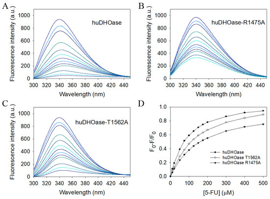 Fluorescence titration of huDHOase with 5-FU. (A) The fluorescence emission spectra of huDHOase with 5-FU of different concentrations (0–500 μM; 0, 10, 20, 50, 75, 100, 125, 150, 175, 200, 300, 400, and 500 μM). The decrease in intrinsic fluorescence of protein was measured at 340 nm upon excitation at 280 nm with a spectrofluorometer. The fluorescence intensity emission spectra of huDHOase were significantly quenched by 5-FU. (B) The fluorescence emission spectra of huDHOase-R1475A with 5-FU of different concentrations (0–500 μM). (C) The fluorescence emission spectra of huDHOase-T1562A with 5-FU of different concentrations (0–500 μM). (D) The titration curves for determining the Kd values. The Kd was obtained by the equation: ΔF = ΔFmax − Kd(ΔF/[5-FU]). Data points are an average of 2–3 determinations within a 10% error.