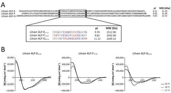 To evaluate the potential of antilipopolysaccharide factors (ALFs) for the nature-based design of novel therapeutics, we synthesized short, linear, cysteine-free peptides (20 amino acid residues) based on the central β-hairpin (the functional domain) of three ALF members (Litvan ALF-E to -G) recently characterized in the penaeid shrimp L. vannamei [11]. This region was selected for peptide synthesis due to the presence of hydrophobic and cationic residues, resulting in high amphipathicity (Figure 1A). Remarkably, while the whole mature peptides Litvan ALF-E (GenBank: FE069658) and Litvan ALF-G (GenBank: GETZ01049665) exhibited anionic properties (pI 6.11 and 5.02, respectively) [11], their central β-hairpins (Litvan ALF-E33–52 and Litvan ALF-G35–54) were highly cationic (pI 9.70 and 11.12, respectively) (Figure 1A). An increase in the pI was also observed for Litvan ALF-F31–50 (Figure 1A) when compared to the mature Litvan ALF-F [11]. In all mature ALFs, the two conserved cysteine residues delimit a central β-hairpin structure that is considered essential for their biological activities [9].