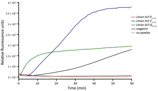 To gain insight into the mechanism of action of the synthetic peptides, we evaluated their capacity to permeabilize the membrane of the Gram-negative E. coli SBS 363 by using the Sytox Green uptake assay. The increase in fluorescence was observed at the beginning of incubation with Litvan ALF-G35–54 and after less than 10 min with Litvan ALF-F31–50 (Figure 2). No significant increase in fluorescence was observed in wells incubated with sterile ultrapure water (negative control) or with Litvan ALF-E33–52, which was not active against E. coli SBS 363 (Figure 2; Table 1). These results indicate that these synthetic α-helical peptides are membrane-disrupting molecules with the ability to permeabilize bacterial membranes as typically observed for cAMPs.