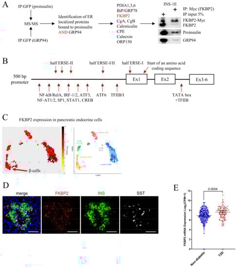 The following supporting information can be downloaded at: https://www.mdpi.com/article/10.3390/biom13010152/s1, Figures S1: INS-1E cells were transiently transfected with GFP-tagged GRP94 or GFP-tagged proinsulin, followed by GFP-tagged immunoprecipitation and analysis via mass spectrometry (MS). MS/MS spectra of FKBP2 detected in GRP94 and proinsulin precipitates are presented. Figure S2: Size exclusion chromatography fractions with FKBP2 elution at molecular weights demonstrating that FKBP2 is expressed as a monomer in INS-IE cells. Figure S3: Sequencing results of exon 3 of fkbp2 after CRISPR/Cas 9 induced insertion of 1 bp C(indicated by red box) in FKBP2l KO clone 1 of INS-1E cells and its wild type counterpart in control clone. Figure S4: Detection of improperly folded proinsulin. INS1-E (Ctrl) and FKBP2 KO cells were lysed, divided into two portions with one alkylated in the presence of 6 mM 4-acetyl amino-4′-maleyl-stilbenes 2,2′-disulfonate (AMS), for 1h, and then both resolved by non-reducing SDS-PAGE and analyzed by Western blotting with anti-proinsulin CCI-17 antibody from Novus Biologicals. Table S1: Plasmids employed for exogenous protein expression. Table S2: Antibodies for immunostaining of pancreatic endocrine cells. Table S3: Primary and secondary antibodies used. Table S4: Primers used during qRT-PCR.