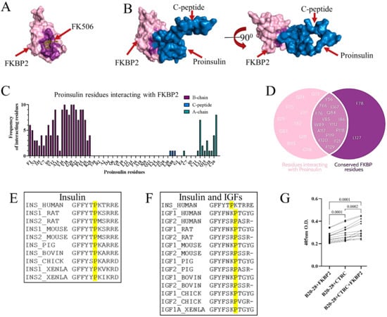 In silico modeling of proinsulin interaction with FKBP2, identification of proinsulin isomers, and demonstration of FKBP2 as a proinsulin isomerase. FKBP2 binding to its inhibitor FK506 ((A), crystal structure PDB: 4NNR) and proinsulin ((B), FKBP2 crystal structure PDB: 2PBC, proinsulin NMR structure PDB: 2KQP, blue) in the representative in silico models. In both structures, the residues involved in the interaction are highlighted in purple. The models were generated on the ZDOCK server. (C). The panel shows the frequency of proinsulin residues interacting with FKBP2 in the top ten generated interaction models between FKBP2 and proinsulin (2PBC and 2KQP structures, respectively). (D). Overlap between proinsulin interacting residues and conserved residues within FKBP2. The data displayed are the combined data from 100 FKBP2–proinsulin interaction models. The conserved residues are highlighted in dark purple. (E,F). Alignment of human proinsulin sequence (UniProt P01308), between positions 23 of the B-chain and position 1 of the C peptide with proinsulin (E) and IGF-1/2 (F) of Homo sapiens (HUMAN IGF1 P05019, IGF2 P01344), Rattus norvegicus (RAT INS1 P01322, INS2 P01323, IGF1 P08025, IGF2 P01346), Mus musculus (MOUSE INS1 P01325, INS2 P01326, IGF1 P05017, IGF2 P09535), Sus scrofa (PIG INS P01315, IGF1 P16545, IGF2 P23695), Bos Taurus (BOVIN INS P01317, IGF1 P07455, IGF2 P07456), Gallus gallus (CHICK INS P67970, IGF1 P18254, IGF2 P33717), and Xenopus laevis (XENLA INS1 P12706, INS2 P12707, IGF1A P16501). Sequences were retrieved from UniProt v. 2021_04. (G). Peptidyl-prolyl cis–trans isomerization assay of a peptide containing Pro28 (GERGFFYTP-F-pNA, B20–28) incubated with or without FKBP2. The substrate peptide was dissolved in LiCl/TFE buffer, and to initiate the reaction, chymotrypsin (CTRC) was added to digest and release the fluorophore (pNA) from the peptide in trans conformation. The absorbance was acquired at 405 nm. The signal from the time point with the highest absorbance in the reaction that contained FKBP2, n-Nitroanilide modified peptide and chymotrypsin was used to generate the graph. Data were analyzed by paired t-test between individually tested conditions.