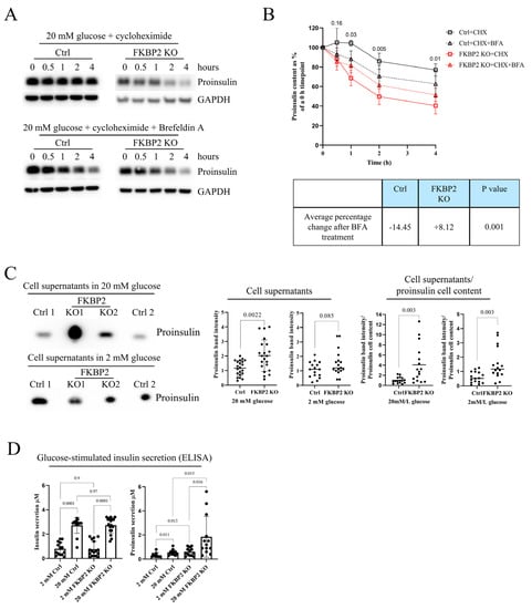 The β-cell has at least two ways of dealing with misfolded PI: by an increase in PI secretion and via intracellular PI degradation. In fact, if PI is not processed within 1 h to mature insulin, it is directed to and secreted via the constitutive pathway [], and an elevated PI secretion is indeed a hallmark of T2D and T1D [,,]. PI secretion and intracellular degradation result in a shorter PI half-life, and in fact, this was our observation upon FKBP2 KO. As shown in Figure 5B, a shorter PI half-life in FKBP2 KO cells is partially a result of increased PI secretion, as prolongation of PI half-life was achieved via the treatment of cells with the ER–Golgi anterograde transport inhibitor, BFA. Importantly, FKBP2 KO impacts mostly PI folding status, as FKBP2-deficient cells maintain normal insulin secretion in response to glucose (Figure 5D).