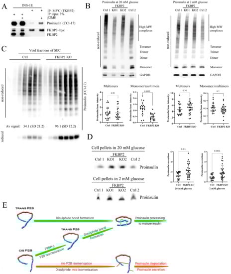 FKBP2 KO increases intracellular levels of high-molecular-weight proinsulin complexes and non-soluble proinsulin fraction. (A). INS-1E cells were transfected with myc-tagged FKBP2, followed 48 h later with immunoprecipitation (via myc tag) and SDS-PAGE/Western blotting to detect proinsulin. Where indicated, cell lysates were pretreated prior to immunoprecipitation for 10 min with 100 mM of reducing agent 2-mercaptoethanol (2-ME), n = 3. (B). Non-reducing SDS-PAGE/Western blot analysis of failed FKBP2 KO (Ctrl 1 and 2) and FKBP2 KO cells cultured for 3 h in 20 and 2 mM glucose conditions. The presence of high-molecular-weight proinsulin complexes was evaluated with a proinsulin-specific antibody as in Arunagiri et al. [], n = 10. (C). Void fractions of size exclusion chromatography of failed FKBP2 KO (Ctrl) and FKBP2 KO cells (cultured for 3 h in 20 mM glucose-containing media) were analyzed under non-reducing and reducing conditions with SDS-PAGE/Western blot to detect proinsulin, n = 3. (D). Insoluble fractions of failed FKBP2 KO (Ctrl 1 and 2) and FKBP2 KO cells cultured for 3 h in 20 and 2 mM glucose conditions were treated with 2% SDS containing loading buffer, boiled for 20 min and analyzed by SDS-PAGE/Western blot to detect proinsulin, n = 10. Proinsulin detection was performed with the CCI-17 monoclonal antibody. All Western blot quantifications were carried out with ImageJ. The data were analyzed by the unpaired Student’s t-test and are presented as means SD ±. (E). A schematic representation of the proinsulin isomers’ folding steps is proposed in this work.