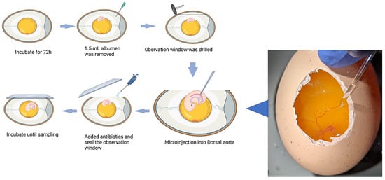 - Korn, M.J.; Cramer, K.S. Windowing chicken eggs for developmental studies. J. Vis. Exp. 2007, 8, 306. [Google Scholar] [CrossRef]