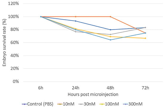 Embryo viability rate in the presence of different H2O2 concentrations 6 h, 24 h, 48 h, and 72 h post-injection. The embryo survival rate was used to determine the toxicity level of the injected concentrations of H2O2. The results showed that the mortality rate did not depend on the treatment dose (p = 0.226), but the incubation period had a significant impact on the survival rate (p = 0.003). The embryonic survival rate means were submitted to two-way ANOVA by JMP Pro14.