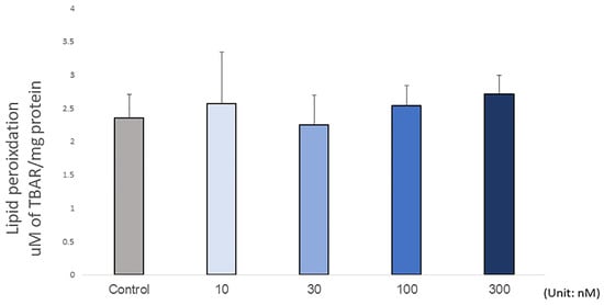 The embryonic survival rate after microinjection varied from 60% to 100% within 72 h post-injection (Figure 2). At 6 h post-injection, no embryonic mortality was observed in any group. At 24 h post-injection, the survival rate of the injected embryos decreased by around 10% compared to the PBS-injected controls. At 48 h post-injection, individuals injected with 300 nM H2O2 showed a 30% lower survival rate than those injected with 10 nM H2O2. At 72 h post-injection, the embryos injected with 100 nM H2O2 showed a lower survival rate than the PBS-injected controls. By comparing all the treatment groups at different time points, results showed that the mortality rate did not depend on the treatment dose (p = 0.226), but the incubation period had a significant impact on the survival rate (p = 0.003). There was no interaction between treatment dosage and incubation time (p = 0.878). Together, these data suggested that H2O2 did not significantly contribute to mortality. Supporting this, the lipid peroxidation results showing the level of malonaldehyde (MDA) in the embryo did not change with H2O2 treatment (p = 0.711; Figure 3), indicating that H2O2 did not cause embryonic tissue lipid peroxidation after 72 h post-injection. This result showed the doses of H2O2 were below the levels at which embryonic lipid peroxidation occurred 72 h post-injection. Together, these findings show that the concentrations of H2O2 used in the present study were safely below the levels at which any embryotoxicity occurs.