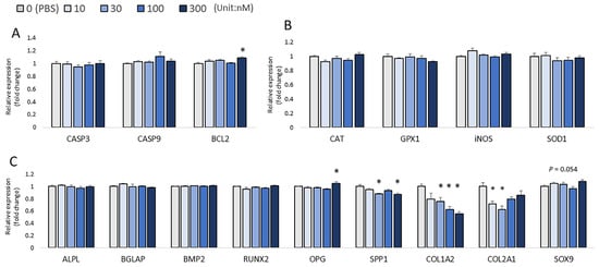 At 24 h post-injection, the expression of BCL2, an anti-apoptosis regulator, was significantly upregulated by the 300 nM H2O2 injection when compared to the control (p < 0.01, Figure 5A). The results of the bone formation markers indicated a general decrease in the mRNA expression levels with the injection of higher concentrations of H2O2. Moreover, the 30 nM and 300 nM H2O2 concentrations significantly decreased the embryonic mRNA levels of SPP1 (p < 0.05; Figure 5C). Furthermore, the 30 nM, 100 nM, and 300 nM groups had a lower level of COL1A2 compared to the control (p < 0.05; Figure 5C). The expression of chondrocyte collagen COL2A1 was inhibited by 10 nM and 30 nM H2O2 compared to the PBS-injected control (p < 0.05; Figure 5C). In contrast, injection of 300 nM H2O2 produced a significantly higher mRNA level of OPG when compared with the control (p < 0.05; Figure 5C), and the expression of SOX9 showed an increasing trend for treatments with higher concentrations of H2O2 (p = 0.054; Figure 5C). However, the H2O2 treatment did not change the mRNA expression of ALP, BGLAP, BMP2, or RUNX2 24 h post-injection. For the correlation analysis, RUNX2 expression was positively correlated with the expression of SOD1 (p < 0.001, R2 = 0.253), and BMP2 expression was positively correlated with the expression of SOD1 (p = 0.002, R2 = 0.218) and iNOS (p = 0.002, R2 = 0.106).