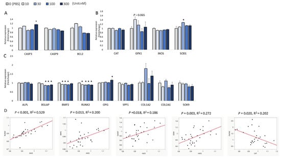 Effects of H2O2 on the mRNA expression of three sets of genes in chicken embryos at 48 h post-injection. (A) Apoptotic genes’ expression; (B) Antioxidant enzymes’ gene expression; (C) Expression of bone formation biomarkers. Each value represents the mean ± SEM (N = 8). Treatments with * showed a significant difference compared with the control using the Dunnett’s test, p < 0.05. (D) The correlation between antioxidant enzyme-coding genes’ expression and bone formation genes’ expression was evaluated by using pairwise correlations (JMP Pro14).