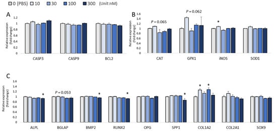 At 72 h post-injection, the lethality rates were up to nearly 35%, but the mortality rate did not depend on the treatment doses. In addition, there were no significant changes in the expression of apoptosis-related marker genes among the treatments (CASP3, CASP9, and BCL2; Figure 7A). The results showed an increasing trend in the expression of CAT (p = 0.065; Figure 7B) and GPX1 (p = 0.062; Figure 7B) with H2O2 treatment. The injection of 10 nM H2O2 significantly increased the mRNA expression of iNOS (p < 0.05; Figure 7B). Additionally, the expression of COL1A2 was found to be significantly increased after treatment with 10 nM and 100 nM H2O2 compared to the controls (p < 0.05; Figure 7C). The highest dose of H2O2 (300nM) suppressed the expression of SPP1, ALP, RUNX2, and BMP2 compared to the control (p < 0.05; Figure 7C). Moreover, BGLAP expression showed a decreasing trend with H2O2 treatment (p = 0.053; Figure 7C). There was no difference in the expression of OPG, COL2A1, and SOX9 (p > 0.05). For the correlation analysis, RUNX2 expression was positively correlated with the expression of iNOS (p = 0.008, R2 = 0.233) and GPX (p = 0.023, R2 = 0.189). COL2A1 expression was positively correlated with the expression of SOD1 (p = 0.046, R2 = 0.140), and SOX9 expression was positively correlated with GPX1 expression (p = 0.003, R2 = 0.292). Moreover, a decreased embryo length was observed in the 100 nM and 300 nM H2O2 groups compared to the PBS-injected control (p < 0.05; Figure 8A,B).