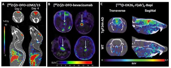 Immuno-positron emission tomography (immunoPET) is a non-invasive in vivo imaging method based on tracking and quantifying radiolabeled monoclonal antibodies (mAbs) and other related molecules, such as antibody fragments, nanobodies, or affibodies [1,2]. Antibody imaging provides a specific and sensitive means of non-invasively characterizing the cell surface phenotype in vivo, which aids in diagnosis, prognosis, therapy selection, and monitoring of treatment for many diseases [3]. Since its inception, the field of immunoPET has been focused on oncology research because mAbs play an important role in the clinical management of cancer [4,5]. In addition to cancer, this technology is attractive for improving our knowledge in the diagnosis of brain disorders, as it is difficult to obtain biosamples from the brain [6]. However, the success of immunoPET in neuroimaging is limited because intact antibodies poorly penetrate the blood–brain barrier (BBB). Due to the poor permeability of the BBB, the delivery of therapeutic bioactive macromolecular compounds to the central nervous system (CNS) is difficult to achieve [7]. For example, only 0.1% of peripherally administered antibodies are delivered into the mouse brain [8]. To overcome this problem, different non-invasive methods have been developed to enhance antibody delivery to the CNS.