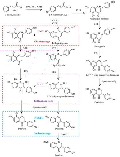 Figure 1. The proposed pathway for the biosynthesis of puerarin. PAL represents phenylalanine ammonia-lyase, C4H represents cinnamate 4-hydroxylase, 4CL represents 4-coumarate:CoA ligase, CHS represents chalcone synthase, CHI represents chalcone isomerase, CHR represents chalcone reductase, IFS represents isoflavone synthase, and C-GT represents C-glucosyltransferase. C-glucosylation during puerarin biosynthesis may take place at the chalcone, isoflavanone, or isoflavone stage. At the isoflavone stage, PlUGT43 catalyzes 8-C-glucosylation, converting daidzein to puerarin [10].