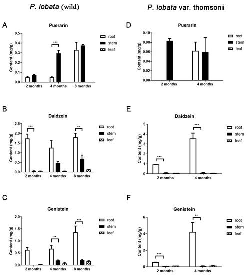 Figure 2. Comparison of the levels of genistein (C,F), daidzein (B,E), and puerarin (A,D) in different tissues at different growth stages of P. lobata (wild) and P. lobata var. thomsonii. Data are shown as the average with standard errors of three biological replicates at each growth stage. Asterisks indicate statistically significant differences between roots and stems (** p < 0.05; *** p < 0.01).