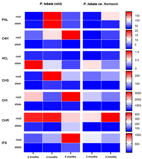 Figure 3. Heatmap representing the expression profile of the upstream isoflavone biosynthetic genes in the analyzed tissues of P. lobata (wild) and P. lobata var. thomsonii during different stages. The transcript abundances were assessed based on their FPKM values calculated from the RNA-sequencing data.