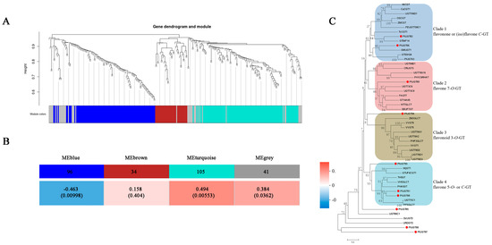 Figure 4. Analysis of the P. lobata glycosyltransferase (PlUGT) genes. (A) Clustering diagram of the 267 PlUGTs by their gene expression patterns. (B) Weighted gene coexpression network analysis (WGCNA) for the correlation of the expression modules consisting of 276 P. lobata UGT genes and the puerarin-accumulation trait. (C) Phylogenetic analysis of the 10 top-ranked PlUGT candidates selected from this study with the previously published known C- and O-glucosyltransferases. The tree was constructed using the neighbor-joining method using MEGA 6.0 software with 1000 bootstrap replicates. Accession numbers of the previously characterized C- and O-UGTs are shown in Table S5 (Supplementary Materials).
