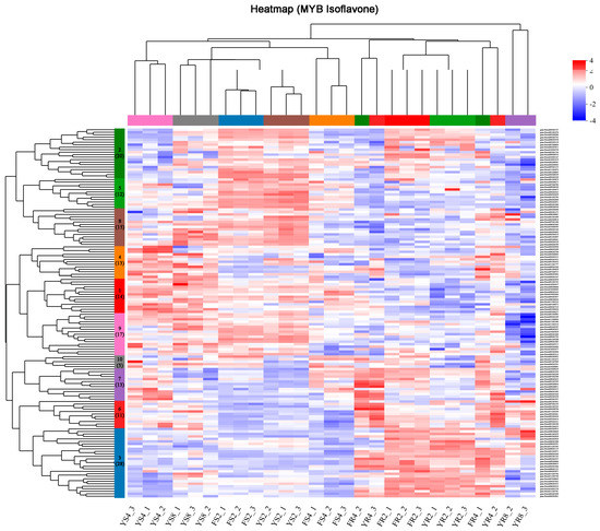 Transcription factors (TFs), which specifically bind to cis-acting regulatory elements in the promoter of target genes, can modulate plant secondary metabolite biosynthesis [34]. In the transcriptome generated by this study, a total of 2849 transcripts were annotated as TFs, and they mainly belonged to the WRKY, MYB, ERF, bHLH, C3H, and NAC families. The present study was focused on the identification of the MYB genes that may regulate isoflavone biosynthesis in the P. lobata species. Initially, 443 sequences, which corresponded to the MYB family TFs, were identified from the transcriptome. After removing the redundant sequences and low-abundance transcripts (a cutoff of FPKM > 1.0 in at least one sample), only 123 MYB sequences were retained for further analysis, and they were provisionally named PlMYB1-PlMYB123. The clustering analysis revealed that these 123 PlMYBs could be grouped into 10 clusters according to their expression pattern in the tissues of both of the P. lobata cultivars during the developmental stages (Figure 5). Through the coexpression analysis, we looked for the PlMYBs that showed a positive correlation with the key genes of isoflavone biosynthesis. Based on the expression profile, PAL was grouped with the PlMYBs in cluster 7, CHS and C4H were grouped in cluster 6, and CHI was grouped in cluster 3.