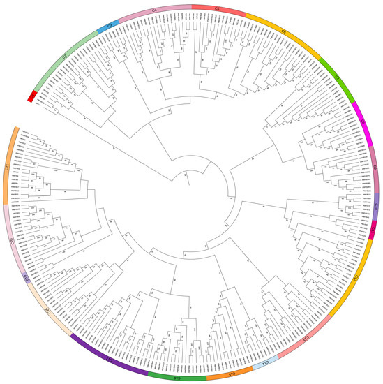 To further evaluate their possible regulatory roles, a phylogenetic analysis was conducted on the 123 PlMYBs together with the previously characterized 161 AtMYBs from Arabidopsis and the 6 GmMYBs from Glycine max. The GmMYBs were included in the analysis because of their experimentally confirmed roles in regulating isoflavone biosynthesis [16,17]. Based on the phylogenetic tree topology, the P. lobata MYB proteins were clustered into 21 clades (C1–C21) (Figure 6). Only three sequences (PlMYB17, PlMYB108, and PlMYB125) were not assigned to any clades (Figure 6). The MYBs in the subfamilies of C4, C5, C6, and C13 were predominantly from the P. lobata species (Figure 6), indicating that the PlMYB sequences in these clades experienced expansions after the divergence of P. lobata and Arabidopsis. Considering that orthologous genes with similar functions are usually clustered in the same clades, the phylogenetic features of the PlMYBs could, therefore, provide insights into their regulatory roles. In clade C5 (Figure 6), PlMYB122 showed the closest relationship to a soybean CCA1-like MYB protein, namely GmMYB133, which is an enzyme that positively regulates the expression of the IFS and CHS genes for isoflavonoid biosynthesis in soybeans [35]. Similarly, in clade 21, PlMYB83 showed phylogenetic proximity to GmMYB29, which also functions as an activator of IFS and CHS expression in soybeans [16]. In clade 4, PlMYB61 lay in the same branch as GmMYB176, which is an R1 MYB transcription factor that regulates multiple genes in the isoflavonoid pathway in soybean roots [36]. Therefore, it is worth further investigating whether the three PlMYB candidates (PlMYB61, PlMYB83, and PlMYB122) could regulate puerarin biosynthesis in P. lobata. The predicted amino acid sequences of PlMYB61, 83, and 122 are shown in Table S7 (Supplementary Materials).