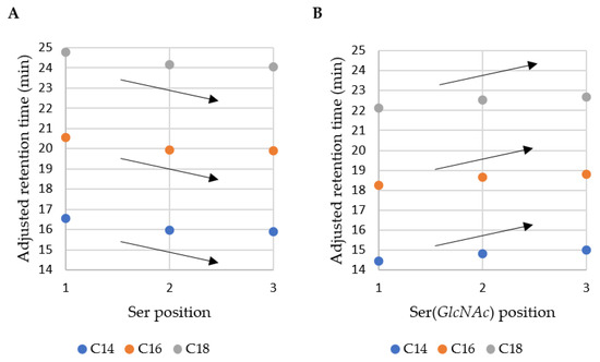 Adjusted retention time of lipopeptides vs. position of (A) Ser and (B) Ser(GlcNAc).