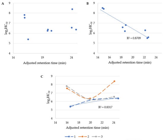Adjusted retention time vs. log2HC50 of (A) USCLs and (B) gUSLCs, and (C) USCLs differentiated into three series depend on serine position.